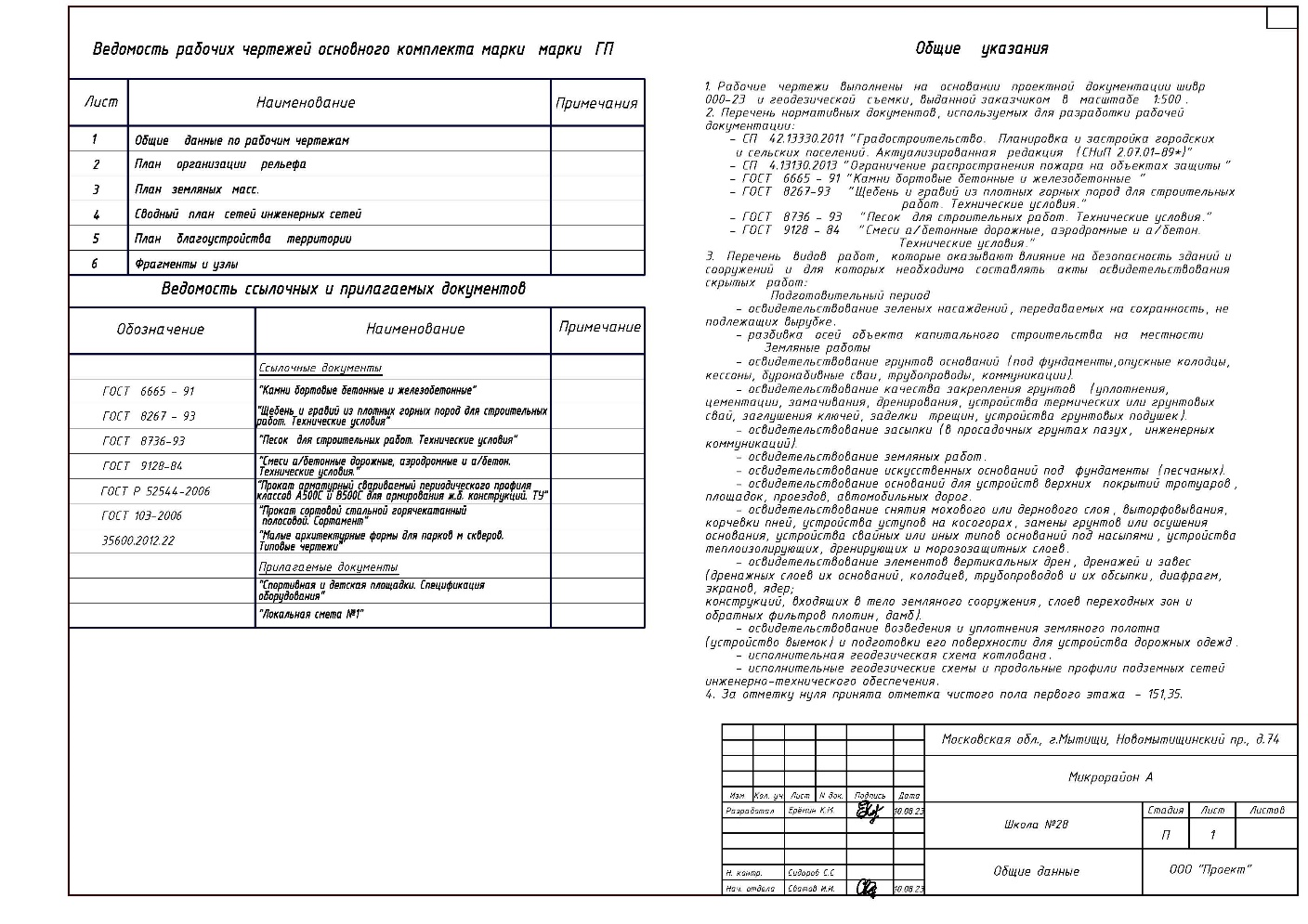 На нормоконтроль проектной организации представлен Альбом №1, являющийся заглавным в комплекте рабочей документации на строительство школы и содержащий основной комплект рабочих чертежей марки "ГП". Выполните нормоконтроль листа №1 "Общие данные" (прилагается).